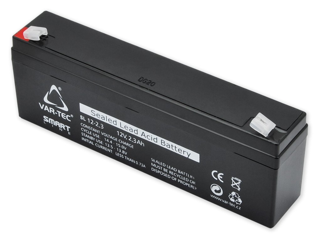 Záložní baterie 12V/2,3 Ah pro alarmové systémy. Životnost cca 3-5 let. Připojení faston 4,8 mm